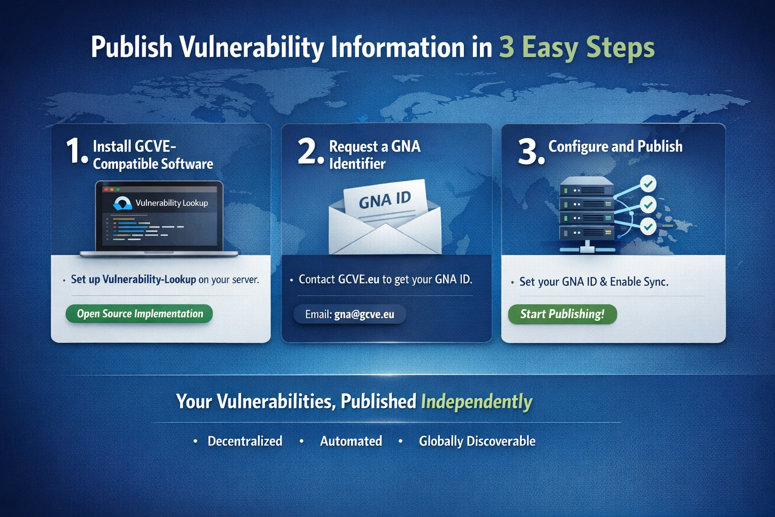 With GCVE, publishing vulnerability information can be done in three straightforward steps.
